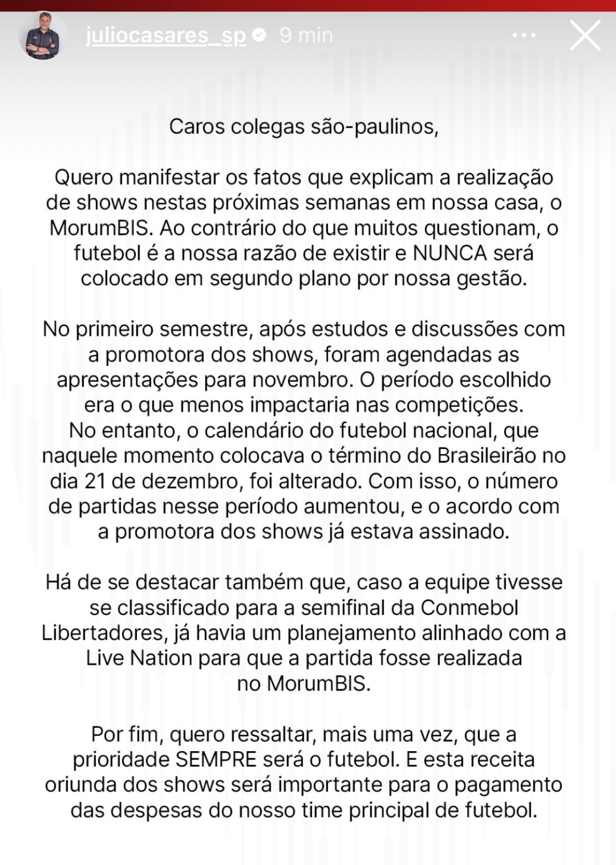 Casares garante que o futebol vai estar sempre no primeiro plano das decisões do clube. Havia até um plano b em caso de classificação na Libertadores. Esse planejamento de show já estava assinado. O São Paulo, portanto, se diz refém das decisões da CBF e do seu presidente Samir Xaud.