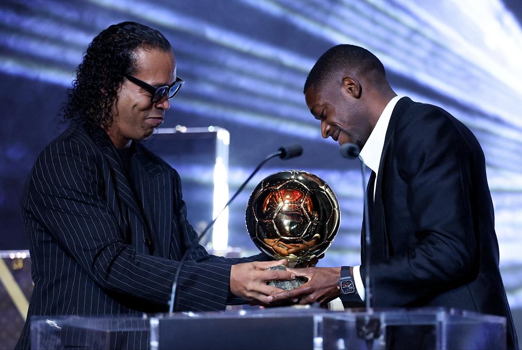 Ronaldinho entrega o troféu de melhor jogador do mundo, bo Bola de Ouro, para o francês Dembélé / Instagram