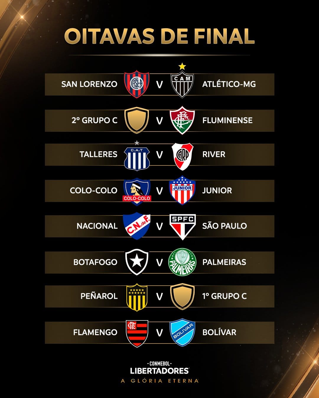 Então, caso os brasileiros passem, eles se cruzam nas quartas. E aí ficam de olho no River Plate, um dos mais fortes da disputa. O time argentino joga as oitavas contra o Talleres. Não será um jogo fácil. Vale lembrar que a Conmebol anunciou a final para a capital Buenos Aires, muito provavelmente na casa do River, um estádio reformado para mais de 80 mil pessoas.