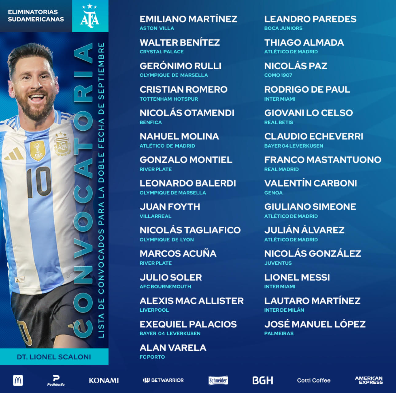 Flaco López, destaque do Palmeiras na temporada, foi incluído na lista dos jogadores convocados da seleção argentina para os dois últimos jogos das Eliminatórias. A relação foi divulgada pelo técnico Lionel Scaloni e representa a primeira oportunidade do centroavante de 24 anos de vestir a camisa da equipe nacional. O jogador ainda terá a chance de atuar ao lado de Messi, de quem já falou ser um profundo admirador.