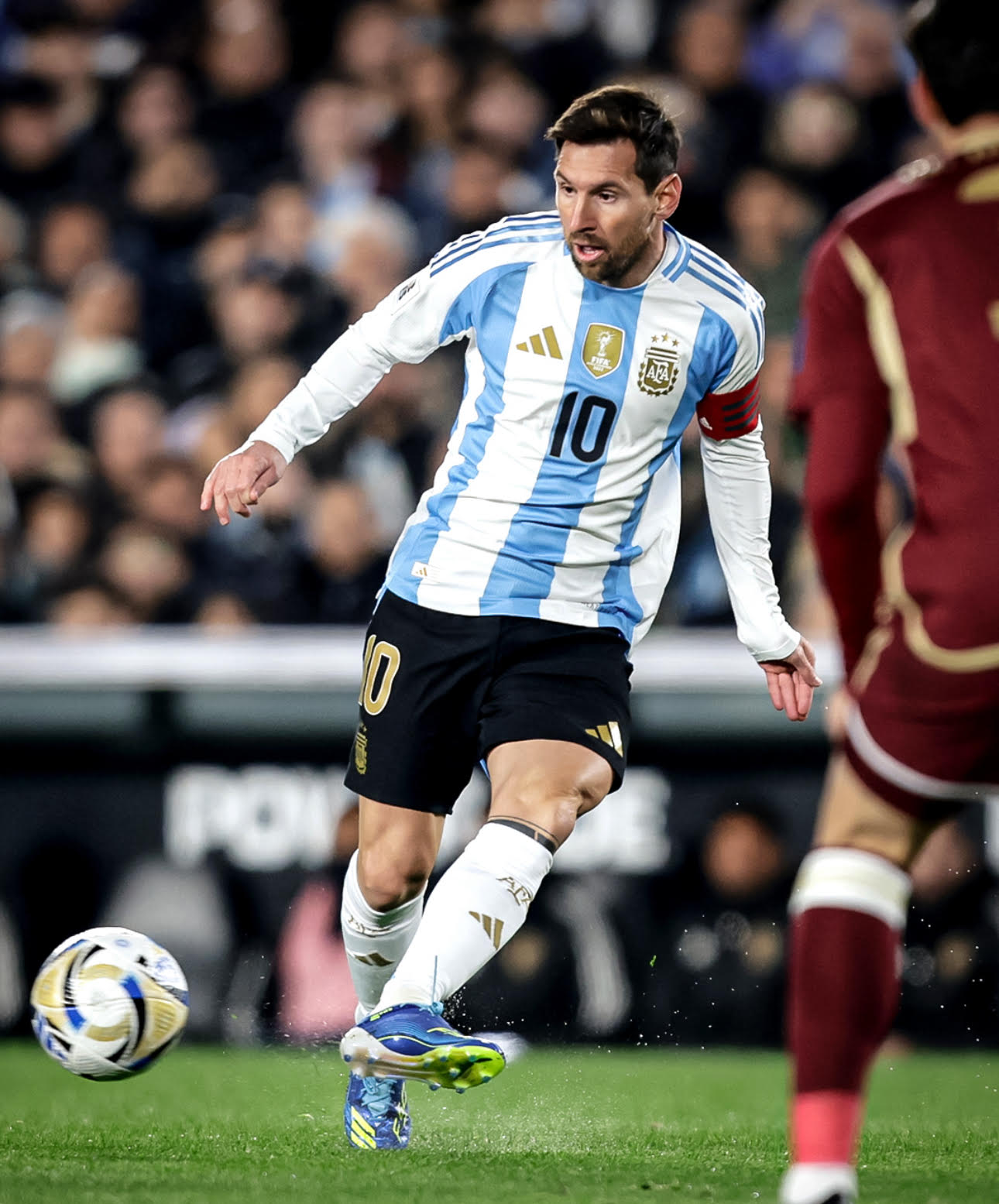 Messi fez dois gols na vitória da Argentina por 3 a 0 diante da Venezuela em partida pelas Eliminatórias. Foi sua última dança oficial pela seleção em seu país. Ele tem 104 gols com a camisa 10 da seleção. Fez dois num Monumental de Nuñez lotado, em festa e de joelhos diante do craque eleito oito vezes o melhor jogador do mundo. Assim que acabou o jogo, a festa começou, com shows de luzes, abraços aos companheiros e muita emoção.