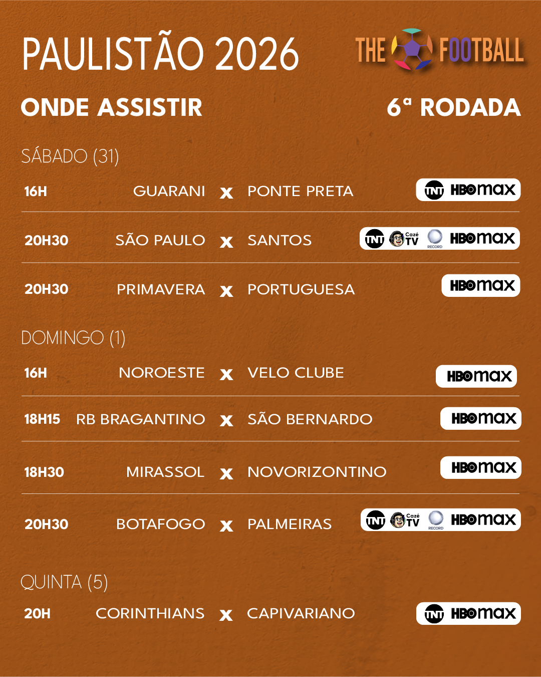 🕓 20h30 – São Paulo x Santos (TNT, Record, Cazé Tv e HBO Max)