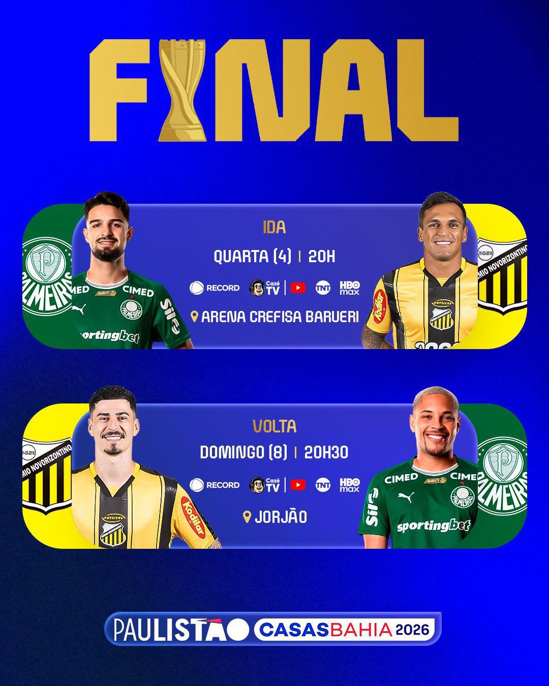 O jogo na quarta-feira será às 20h, um pouco mais cedo do que a FPF e os clubes vinham praticando no Estadual. Mas a decisão de domingo, na casa do Novorizontino, terá o mesmo horário dos jogos das semifinais: 20h30. O Palmeiras jogaria no Allianz Parque se tivesse o direito de atuar na segunda partida como mandante. Mas o time de Abel não teve a melhor campanha no critério de saldo de gols, uma vez que os finalistas empataram na somatória dos pontos.